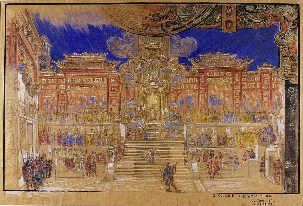 Some decades later, de la Croix’s story was adapted into a stage play and from that, a German language version was written, entitled “Turandot, Princess of China,” and performed in 1801. It was, supposedly, this latest take on the legend that inspired Puccini’s opera.