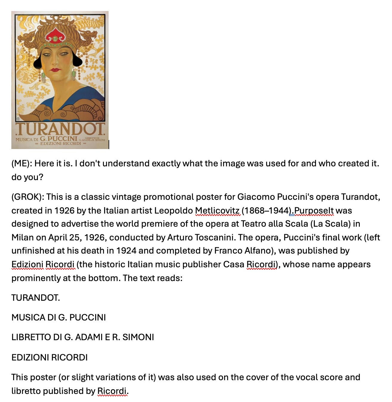 The striking image above is the cover art for the score of the great Puccini opera “Turandot.” The artist who created it was Leopoldo Metlicovitz, an Italian. Turandot, in case you’re wondering, is the name of the Chinese princess featured in said opera. In the story, the Princess Turandot refuses to marry, going so far as to execute any suitor unable to solve three riddles she puts to them.